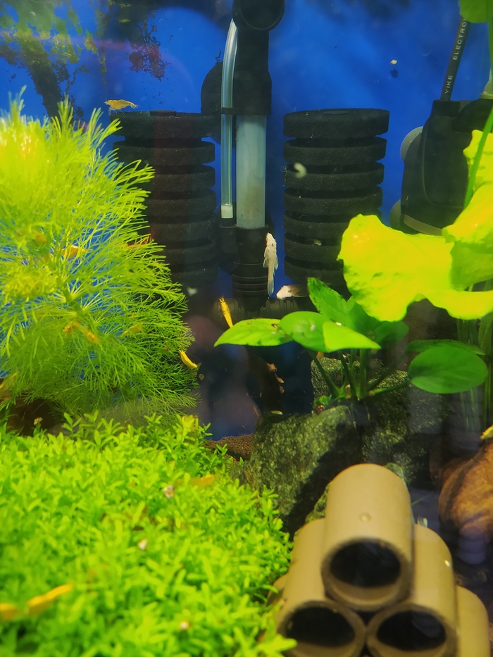 В тазике сделала мини- аквариум. По дну трубка с аэрацией. Маленький фильтр засунула в капроновый носок (особо смысла от него не будет, но микрогрязь засосет), температура воды 18 градусов.