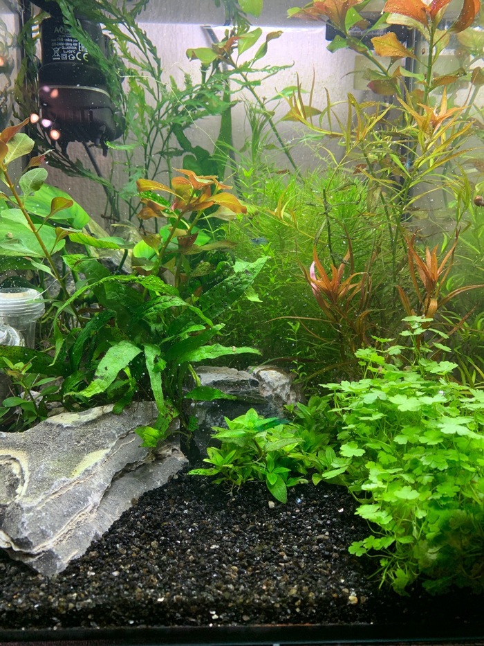 Осталось фон закрепить - все руки не доходят купить.и еще пару растючек каких нибудь. Банка акваэлевкий 30л кубик. СО2 бражка в полторашке. Дифузер керамический 3 в 1 (клапан обратный, счетчик пузырей). Население - три самца гуппи - доча так решила и десятка полтора креветок блю карбон. И да - полезла вот такая ниточка: