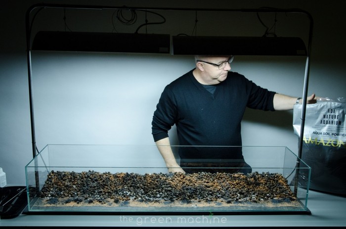 Далее высыпаем питательную подложку ADA Power Sand Special L, объем будет зависеть от размеров выбранного аквариума.