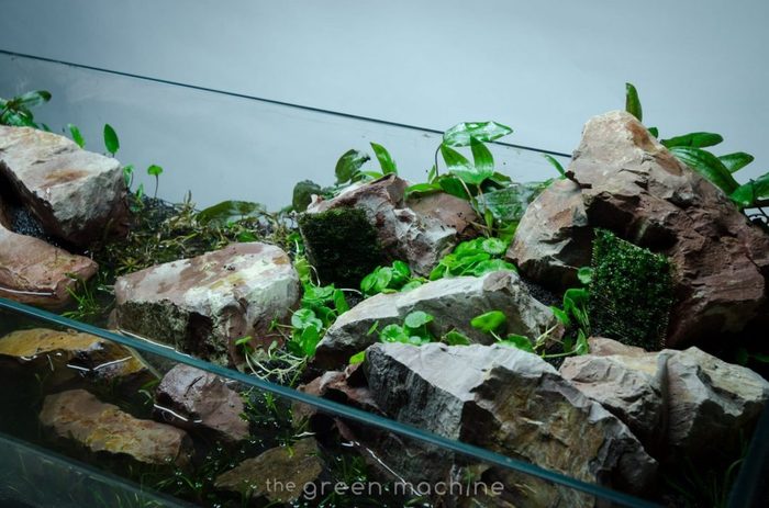 После расстановки акцентов можно добавить пару штрихов эпифитными растениями (например, буцефаландры и анубиасы), воткнув их между камнями.