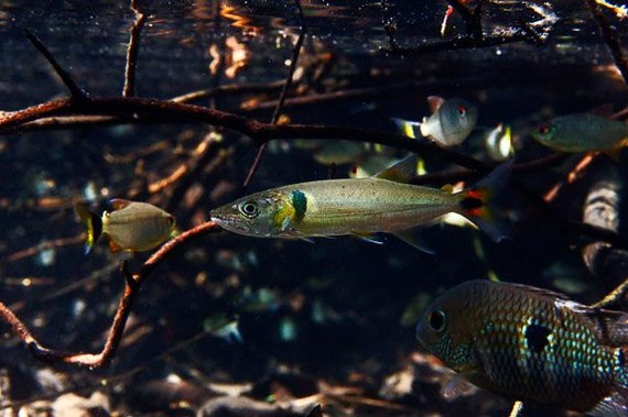 Акулий бала (Balantiocheilus melanopterus) — стройные серебристые рыбки с золотистыми боками и желтовато-белыми плавниками с черной каймой. В природе вырастают до 40 см, в аквариуме чуть меньше. По виду напоминают акул, особенно спинным плавником – отсюда и название. Сходство это, к счастью, только внешнее. По характеру очень подвижные, но мирные и парой даже пугливые, до такой степени, что могут погибнуть от сильного стресса. По ночам издают щелкающие звуки.