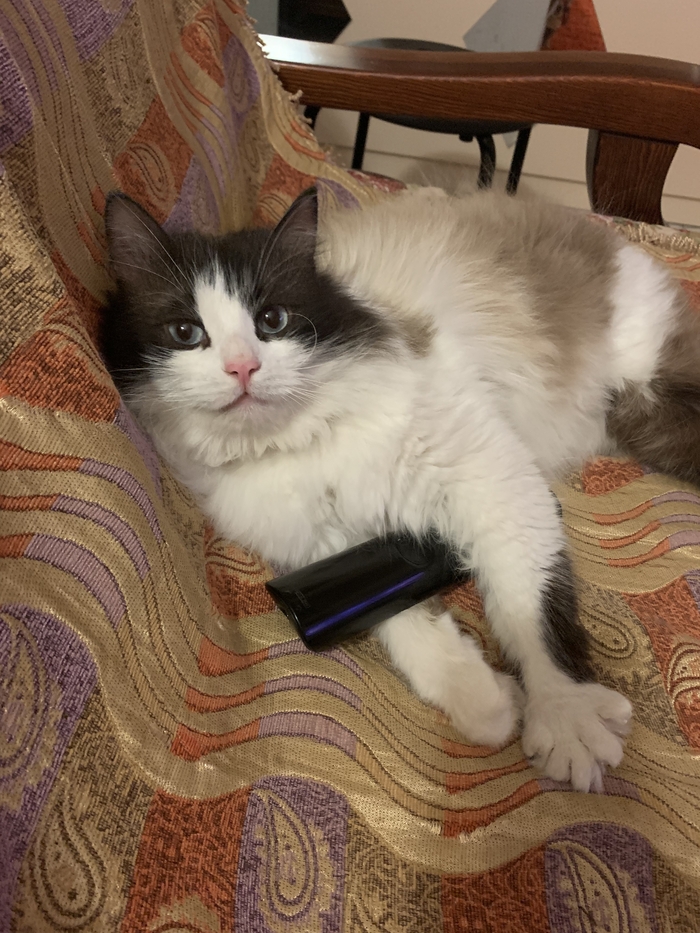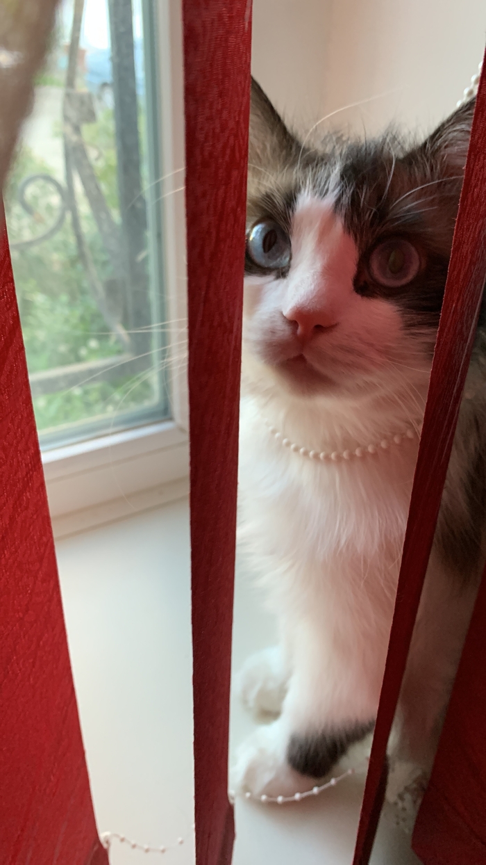 На улице было зимнее утро, темно и -30. Я стояла на остановке одна и откуда-то вынырнули эти голубые бриллиантовые глаза и заглянули мне прямо в душу. Жалобное мяукание и я уже прикидываю могу ли я его прямо сейчас взять домой? Нет, не могу. Ответственная работа, опоздать нельзя. Дома нет дверей (только в спальню) и я не могу его пустить пока я на работе. С тяжёлым сердцем уезжаю.