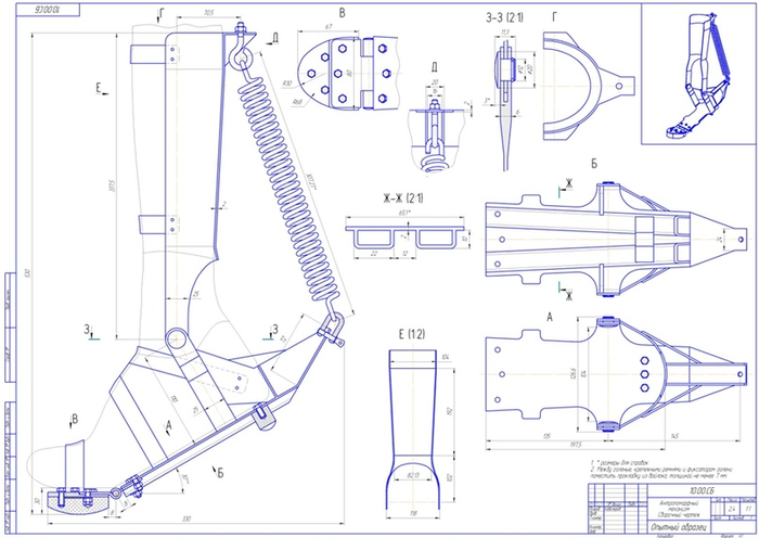 В ногах стояли возвратные пружины. Они помогали экзоскелету сохранять вертикальное положение,, то есть тянули ноги на выпрямление. Сами ноги прижимались шлейфами с замками и металлическими затяжками.