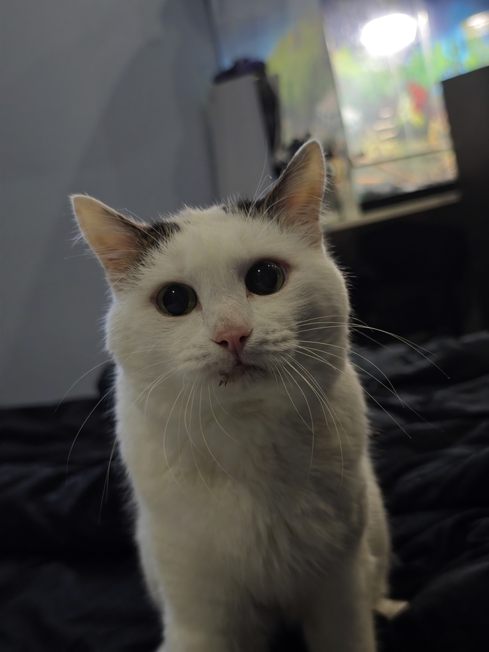 Неська появилась в семье год спустя после Мики, когда я случайно увидела в местной группе объявление с просьбой приютить сбитого машиной котёнка со сломанной задней лапой. Перелом в итоге сросся, но началась сухая гангрена, и лапу пришлось ампутировать. Носиться по квартире и запрыгивать на небольшую высоту ей это не мешает совершенно. По характеру — самая добрая в мире кошка, мурчунья и ласкуша. Любит кушать варёных куров, бодать лбом маму и папу, страшно бояться всех незнакомцев, отращивать толстые бока, периодически сидеть с несчастным голодным видом, ходить по пятам за старшей, не обращая внимания на её шипение и бурчание, а также периодически троллить Мику, прыгая через неё с разбегу (за что получать лапой по лбу).