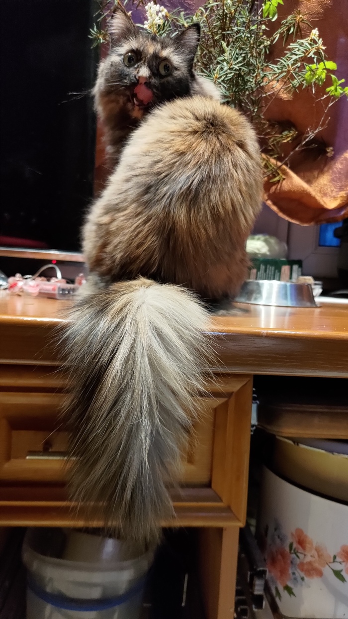 Был подкинут на работу, выглядел больным, пожалела, взяла лечить чтобы потом пристроить, ну знаете. Спустя два года чувствует себя лучше, но к сожалению как оказалось он больнее, чем думали, у него (скорее всего) ВЛК, анализы были разные, но здоровье у него действительно так себе. Тем не менее он в основном бодр и весел, очень добрый мурчащий котик, очень любит мясо, играть с игрушечными мышами и спать. Почти год пытался подружиться с моей кошкой-шиншиллой, но получал в ответ только насилие и забил.