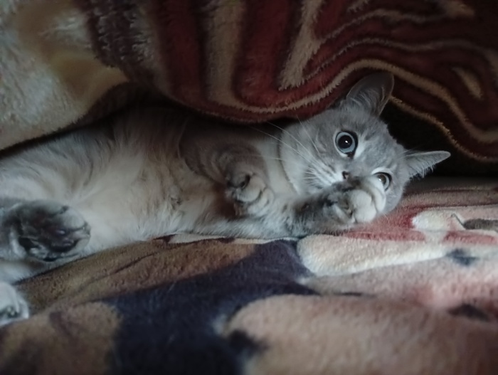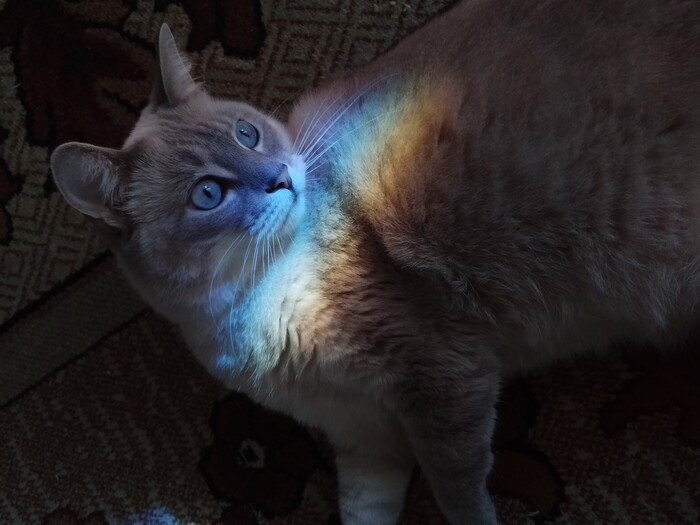 Его бабушка была тайской кошкой, и от нее он получил интересный окрас, голубые глаза и вредный характер.