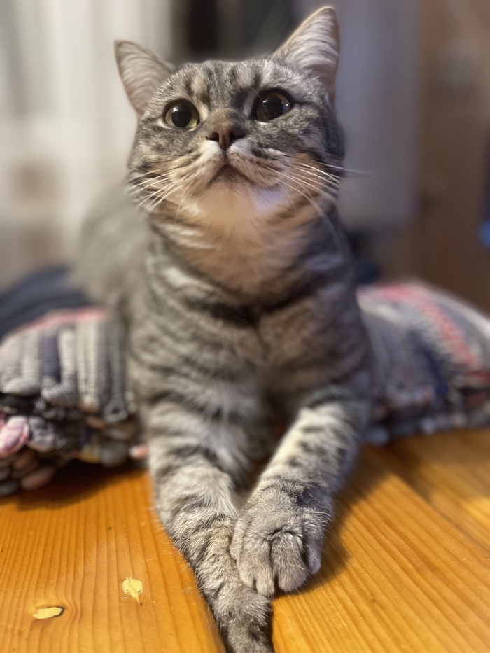 Котик, спасенный моими детьми от верной смерти, подрос. Внешность мелкого серого недоразумения претерпела значительные изменения: парень поправился. Бессмысленные голубые глазенки приобрели янтарный цвет, а на сереньких боках проступили роскошные черные узоры. По-моему, такой окрас у кошек называется «черный мрамор» (если ошибаюсь -прошу пардону. Я не специалист, увы😁). Мелкий красавчик вызывает острую неприязнь у младшей мейнкунши Невады и горячую любовь у остальных домочадцев. Вот он какой стал: