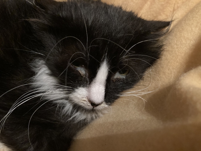 По приезде в приют оказалось, что у кота за правым ухом обнаружилось небольшое лишайное пятно. Его там как раз обрабатывали каким-то препаратом.