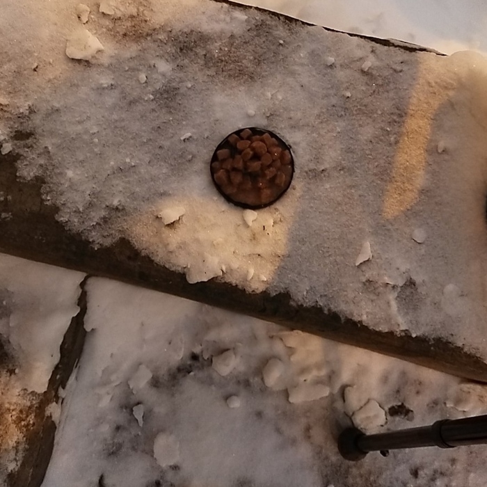 Возвращался буквально минут через 15 - успели, молодцы. Но надо переходить на сухой, думаю.(А его на 20 рублей не купишь...) Или класть корм в их окошечко в подвал, там потеплее. Как только проползти туда по сугробам - с моими полутора ногами+... Ладно, разберёмся. ("+" - имеется в виду трость)