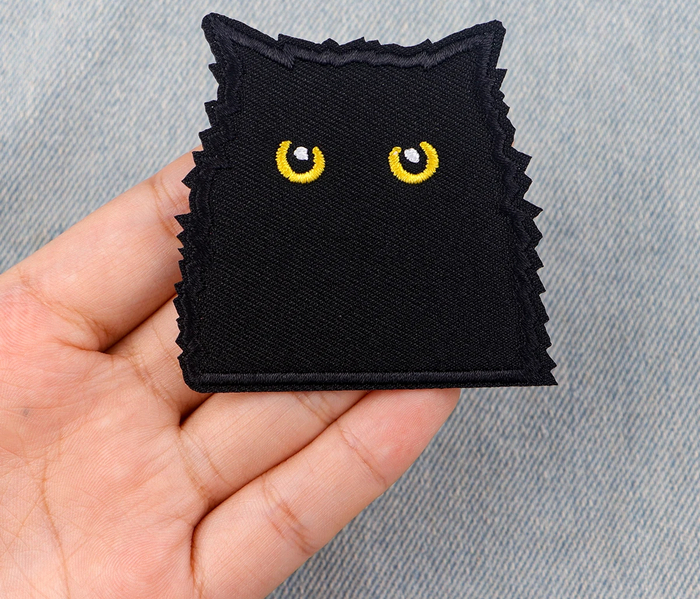 Термоклеевая нашивка с вышивкой в виде злого чёрного кота с жёлтыми глазами. Приклеивается с помощью утюга на одежду или рюкзак. Стоит такая около 87 рублей. ссылка на неё