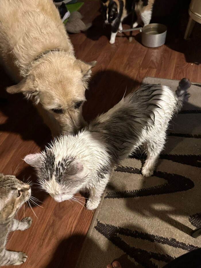 Мне удалось ненадолго от него избавиться и добежать до подъезда, который оказался закрыт. Ключи в кармане, рука с той стороны занята котом, этот оборзевший кот рядом… Но ура! Рядом валялось старое мусорное ведро, и со второй попытки я смогла им так напугать кота, что он наконец свалил. Наконец-то можно открыть дверь, зайти в дом, отпустить кота, чтобы он успокоился, осмотреть его и убедиться, что с ним всё в порядке, а потом обалдеть от количества крови на футболке и срочно начать обрабатывать раны.