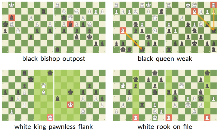 Примеры категорий человеческих концепций включают прочную позицию черного слона, закрепленного пешками в глубокой зоне белых, слабую позицию черной ферзи, находящуюся под атакой или связывающуюся с фигурой, позицию белого короля на краю доски без пешек и белую ладью на полуоткрытой линии без противодействия пешкой.