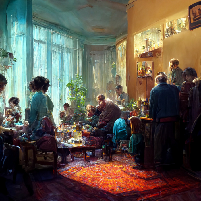 Через пять минут мы уже сидели за шумным столом, где за спинами наперебой спорили два телевизора. Дядя Валера, мой отчим, предпочитал первый канал, а тётя Груня, поймавшая нас в подъезде, его сестра – второй.
