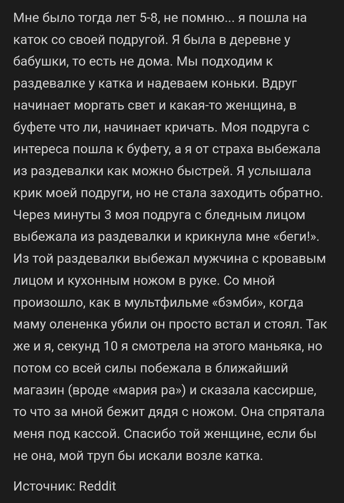 Одно из самых тёмных воспоминаний: я ощущал каждой клеткой своего тела постороннее присутствие. Когда стоя в ночном доме, затылком чувствовал чей-то взгляд. Это чувство всем известно, но многие из скептицизма списывают это на банальный страх темноты и неизвестности. В тот момент во мне проснулось что-то древнее, на уровне инстинктов, которое предоставило мне выбор - бей или беги. Я никогда не боялся темноты, поэтому я выбрал первое и закрыв глаза (потому что они бесполезны ночью) я повернулся в сторону, откуда исходила опасность и сказал: