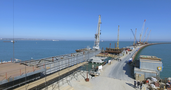 На другом строительном участке – на керченской стороне – началась надвижка пролетов на морские опоры. Их укрупнительная сборка из заводских блоков выполняется на берегу, на специальном сборочном стенде. По мере готовности пролеты один за другим надвигаются над акваторией по скользящим направляющим с помощью мощных домкратов.