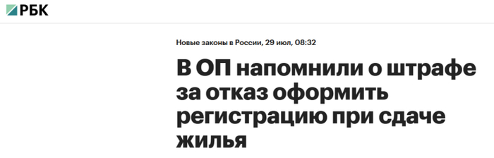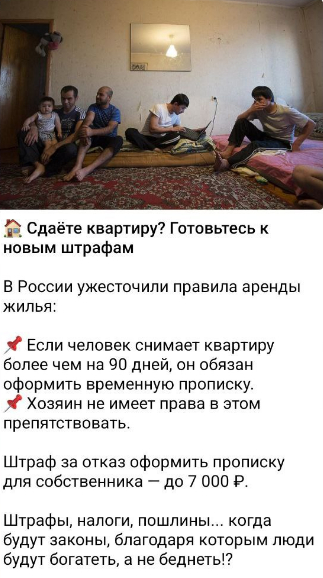 В проукраинских каналах пишут, что в России увеличили штрафы для собственников, которые не оформляют прописку арендаторам, снимающим жилье более 90 дней. Штраф за это может достигать до 7 тыс. рублей.
