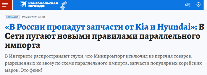 Автомобилистов пугают запретом на ввоз автозапчастей и другой продукции от южнокорейских брендов Hyundai и Kia. Утверждается, что Минпромторг якобы исключил товары компании из списка для параллельного импорта.