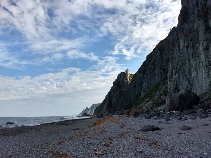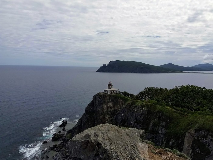 Маяк в рабочем состоянии. На против - мыс Ватовского.