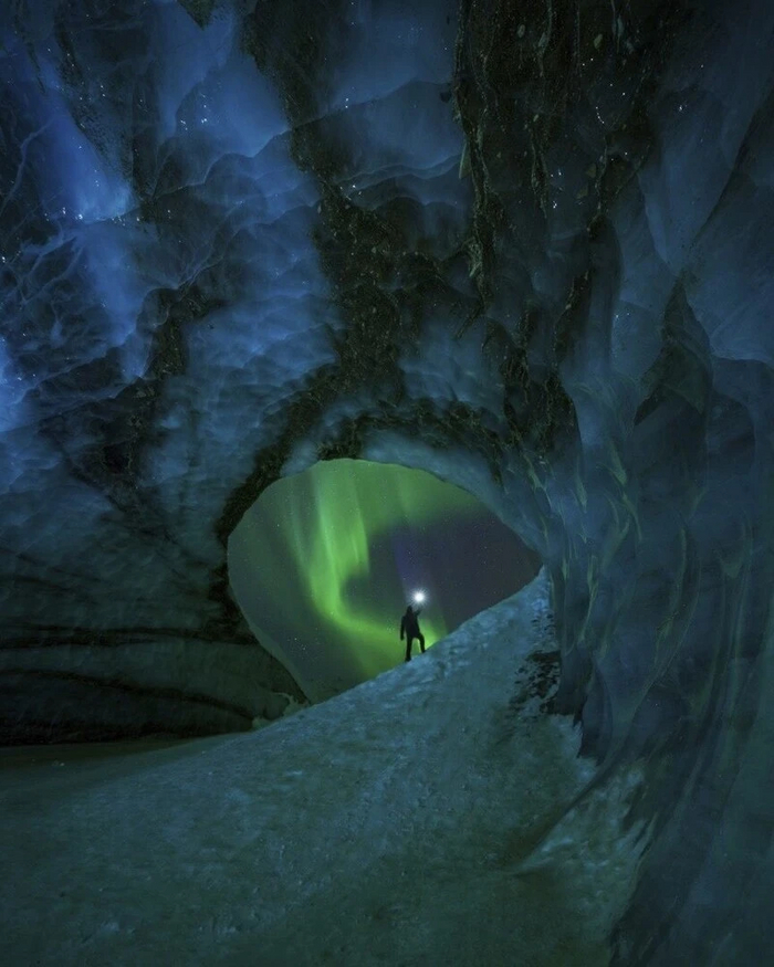 Северное сияние в ледяной пещере ледника Кастнер на Аляске, который обрушился в июле этого года. Фотограф David Erichsen.