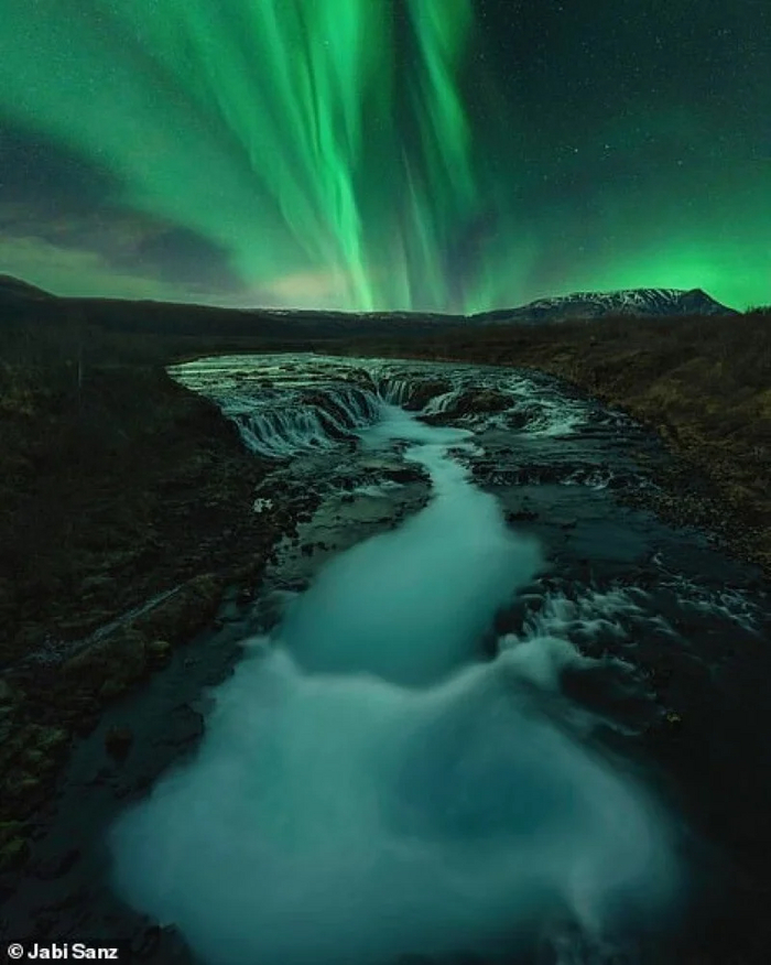 Водопад Бруарфосс на западе Исландии освещен полярным сиянием. Автор фото - Jabi Sanz.