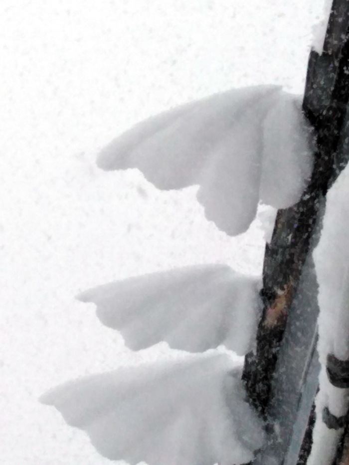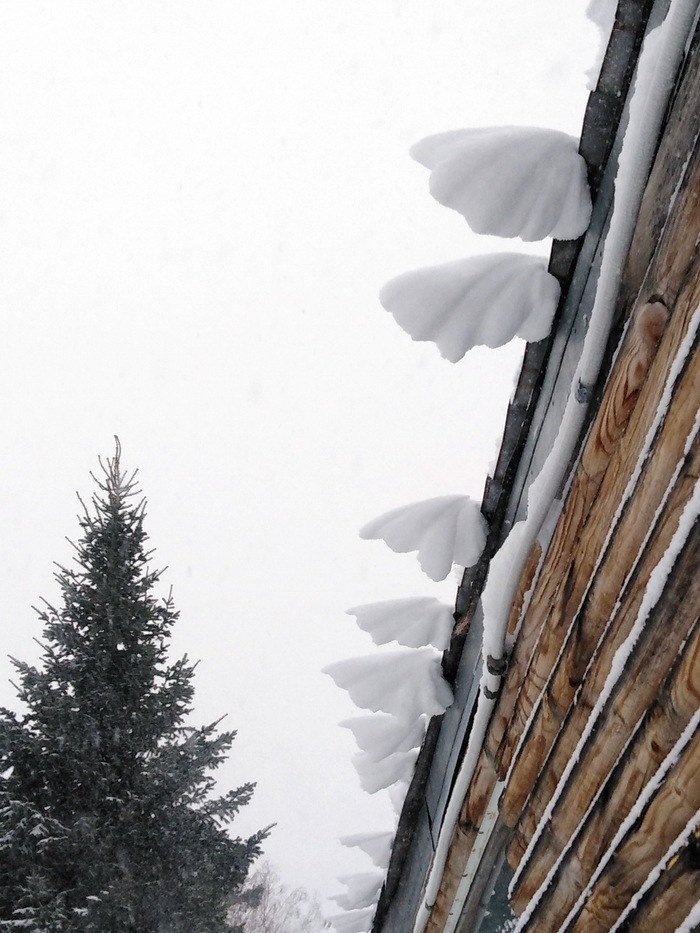 Поднимаю глаза, а там ветер старается, узоры лепит. Дует по крыше, завивается. А снег липкий да тяжелый лететь по ветру совсем не хочет, слипается. Так снег с ветром и борются.