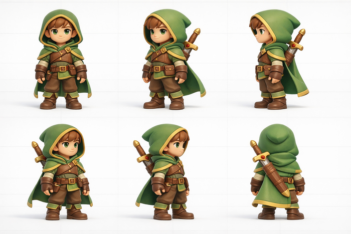 Character design sheet featuring the same character from multiple angles. TOP ROW (left to right): 1) Front view - facing camera, neutral pose, arms at sides 2) 3/4 LEFT angle - rotated 45 degrees left, slight turn 3) LEFT PROFILE - perfect side view, 90 degrees BOTTOM ROW: 1) 3/4 RIGHT angle - rotated 45 degrees right 2) RIGHT PROFILE - opposite side view, 90 degrees right 3) BACK view - facing away, back of character CHARACTER DESCRIPTION: A young ranger, human male, green hood, brown leather armor, sword at hip, confident stance. Consistent face, proportions, outfit across ALL views. TECHNICAL REQUIREMENTS: - Orthographic camera (flat, no perspective distortion) - Equal character height in each cell - Consistent lighting from top-left across all views - White background with thin grid lines - No background scenery, pure character focus - Professional animation reference quality