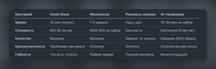 Если коротко: AI для ассетов работает, но не для всего. Генерация игровых ассетов с помощью нейросети для создания картинок – это не замена художнику, но мощный инструмент для инди-разработки игр. Особенно если делаешь прототип, MVP или casual игру с ограниченным бюджетом.