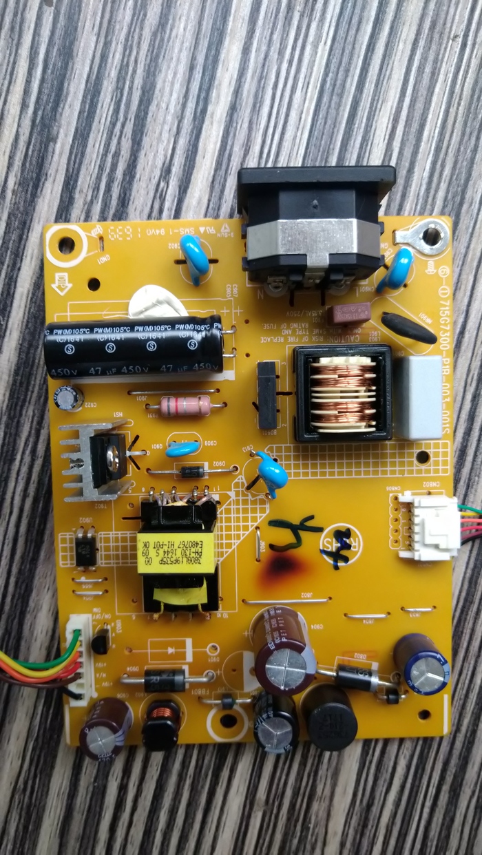 Монитор не включается. По моему мнению проблема с подсветкой. На плате блока питания есть сгоревший элемент (резистор 100 Ом)