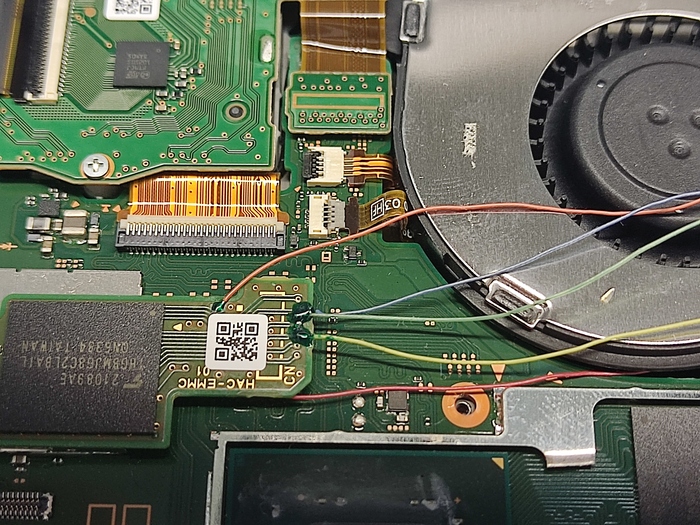 Далее необходимо припаять провода на плату emmc согласно инструкции,изолируем места пайки УФ маской ,выглядит это так.
