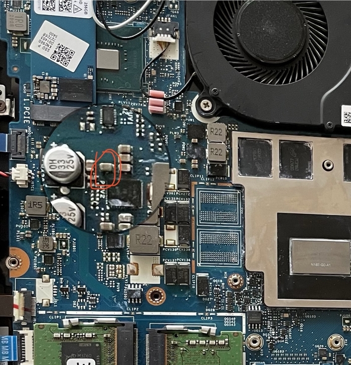 Так же он показал на плате ещё 2 места, где на элементах был зеленоватый налёт (явно видимый, но я его не замечал раньше), сказал, что плата была залита. Но я уверен, что нет и что ноут работал до того, как я в него полез.