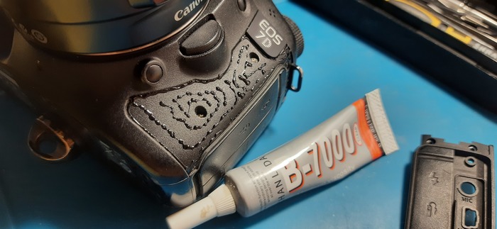 Вставляем новый слот с заглушками и кладём фотоаппарат таким образом чтобы удобно было нанести клей , этот клей в случае необходимости легко снимается. Чтобы заклеить накладку , на двухсторонний скотч старый не стоит надеется, но и суперклеем не надо испытывать судьбу.