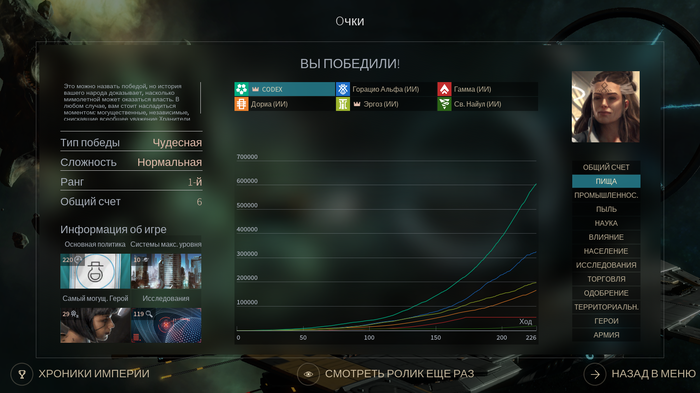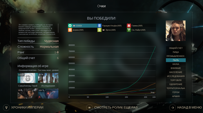 И так, закончила первую партия в Endless space 2, на среднем уровне сложности, так как, в свое время, ИИ, в endless space и endless legend, первые игры две, на среднем уровне сложности легко меня обгоняет по очкам и я все время шла где то в середине таблицы.