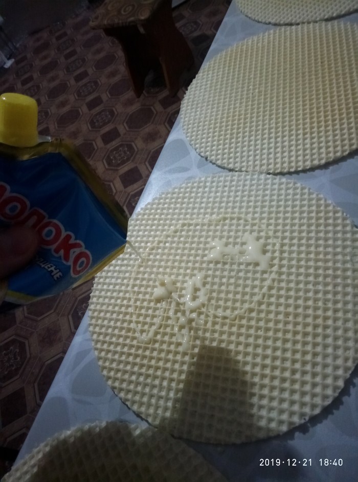 И тепер зигзагообразными движениями наношу молоко на вафлю. Где-то на третьей уже начал делать это равномерно и красиво. Таким образом я заполнил все вафли и сложил их друг на друга. Для начала они полежат на одной стороне минут 10, затем переварачиваю, что бы сгущенка обволокла все сверху и снизу. И можно кушать. Но обычно я его съедаю, как только последний корж кладется на верх:)