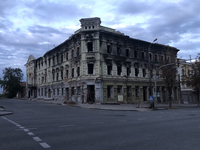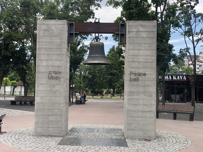 Вот этот находится на территории церкви Киевского патриархата, очень символично. Архангел Михаил с опущенным мечом на территории церкви на фоне пострадавшего от войны здания: