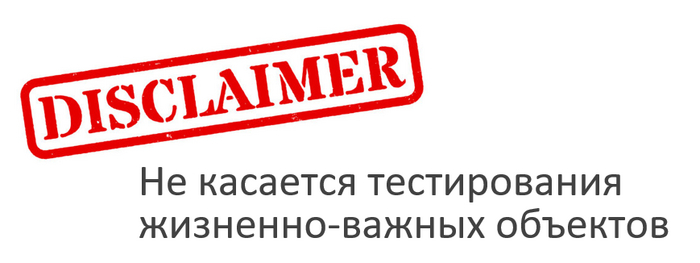 На следующий день он написал, что посмотрел начало доклада и дальше не стал смотреть, ибо в начале сказана не правда, значит всему остальному тоже верить нельзя. Я сначала не поняла в чем прикол, начала выяснять что ж ему не понравилось. Оказалось, что он зацепился за фразу, которую я говорила на 2-м слайде: дисклеймер, что предлагаемый мной подход к ведению тестов не подходит для критичных систем типа медицины, авиации и т.д., вот такой: