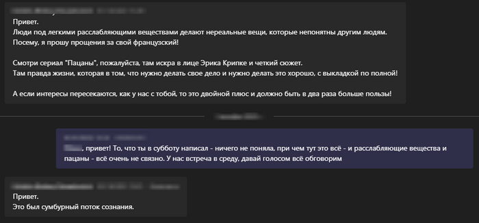 Третий треньк звоночка был в одни из выходных, когда он мне в рабочий мессенджер в личку написал поток сознания:
