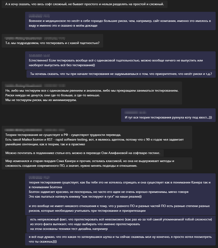 Потому что если тестировщик (тем более, с таким опытом) считает, что тесты не надо приоритизировать исходя из назначения системы/кусков системы, то это как минимум странно. Если тестировать всё одинаково тщательно, то можно никогда не закончить тестирование и не выпустить продукт. Один из семи основных принципов тестирования гласит, что «исчерпывающее тестирование невозможно» и этому учат на всех курсах для тестировщиков. Да и в целом, приоритизация тестов в зависимости от бизнес-целей – это очень значимый кусок работы тестировщика. В тот раз мы довольно жестко поспорили, но от своей точки зрения Д так и не отошёл.