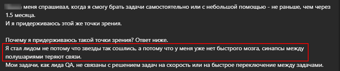 Дальше я стала более внимательно приглядываться к своему новому тестировщику, узнавала у команды как он там работает, что делает. Получала неутешительные сведения о том, что он все еще изучает документацию, а к задачам вообще не приступал, хотя ему уже и намекали и прямо говорили и внутри команды и я (а это прошел уже месяц, обычно новые тестеры начинают брать хоть какие-то задачи чуть ли не на второй день, т.к. на задачах легче всё освоить, чем просто в теории).
