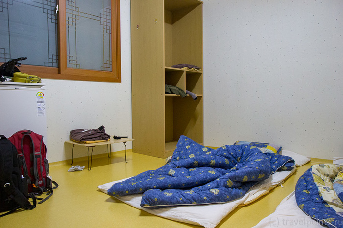 После обеда у нас был запланирован осмотр местных достопримечательностей, но мы не смогли. Все-таки сегодняшний подъем в 4 утра не прошел даром. Мы отправились спать. Сначала собирались поспать часок, но в итоге проспали до утра, едва не поджарившись в процессе. Комната была в корейском стиле, без мебели, с матрасиком и теплым полом. Панель управления полом оказалась полностью на хангыле, без английского. С горем пополам я нашла, как она включается, но регулировать температуру так и не научилась, в итоге всю ночь приходилось вставать, чтобы включать или выключать ее. А утром мы продолжили свое путешествие.