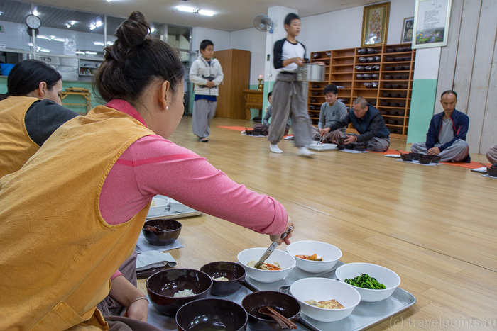 Началось все с ужина. Большой зал для еды, в одном конце — раздача. Обувь все оставляют при входе. Накладываешь еду в свою тарелочку, садишься на пол за низкий столик и кушаешь палочками. Сразу надо предупредить: еда в монастыре строго вегетарианская и очень корейская, то есть острая. Из не острого — рис. Из напитков — только вода. На десерт — немного фруктов. Мяса, молока, яиц, сладкого, газировки и так далее нет. Если вы без этого всего этого не можете, то берите с собой и ешьте ночью под одеялом у себя в комнате, так, чтобы никто не видел, потому что официально есть мясо, курить и распивать алкоголь на территории монастыря запрещено, о чем предупреждают при заезде :). До ближайшего магазина, если что, километра три пешком 🙂 Видимо как раз для тех, кому совсем тяжко, на улице все-таки стоит автомат, в котором можно купить шоколадный батончик или кофе.