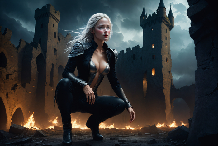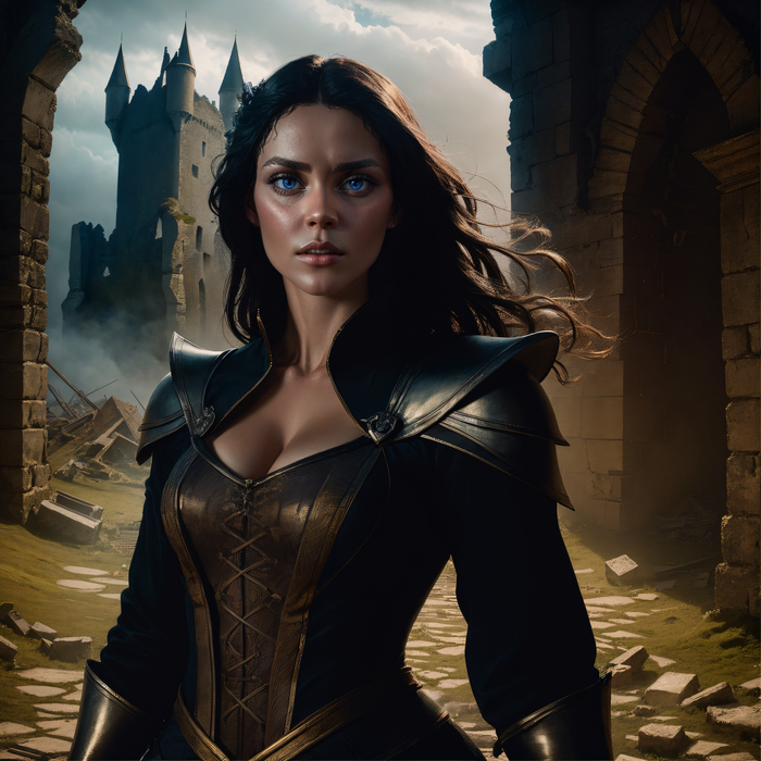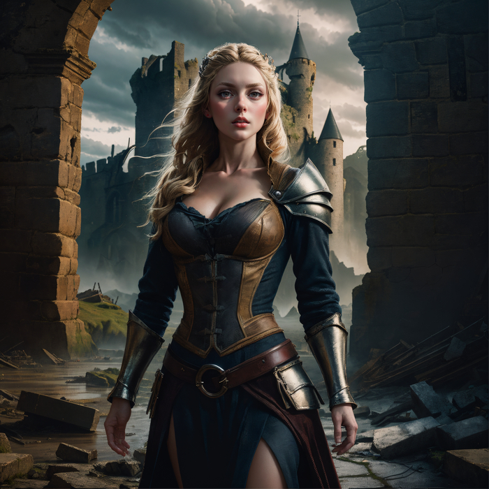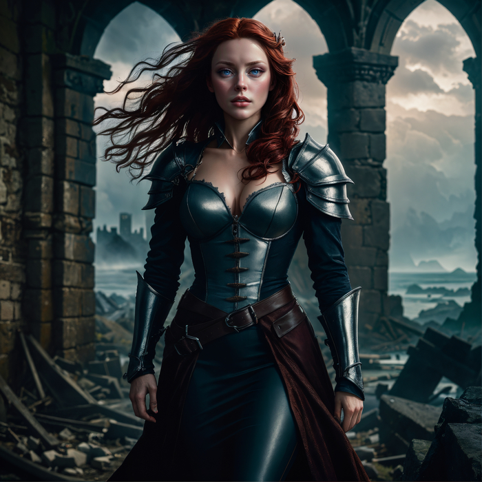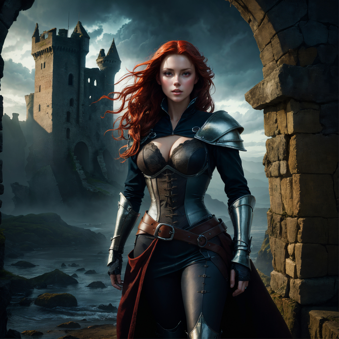 action-packed, a beautiful woman standing against the background of a (ruined castle:1.3), enchantress, around a (gloomy atmosphere:1.5), (full body portrait:1.6), (very sexy clothes:1.5), red hair, 3d style, ((best quality)), ((masterpiece)), ((ultra realistic)), detailed soft oil painting, detailed background, dramatic cinematic lighting, soft edge lighting, professional, dramatic lighting, hard edge lighting,