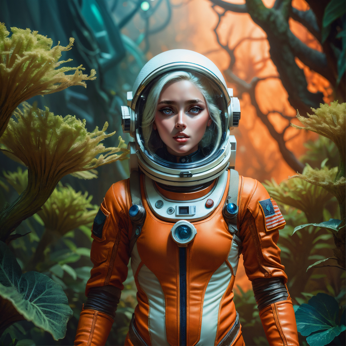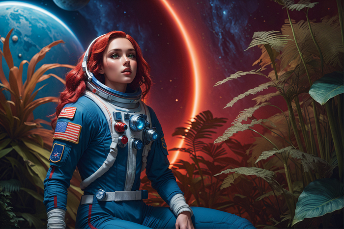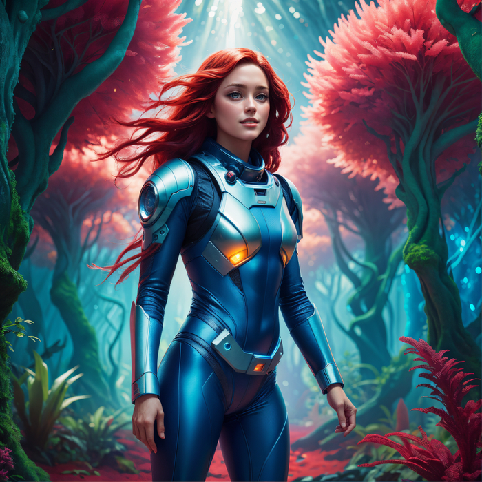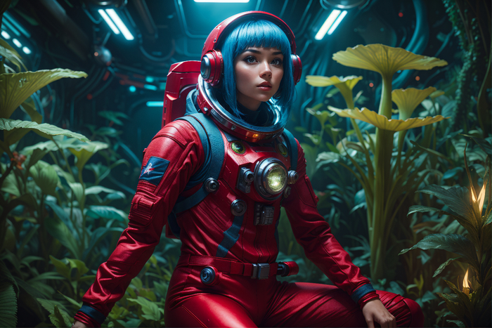 action-packed, a beautiful astronaut woman dressed as an astronaut, sits and looks at something on the floor, stands in a grove of alien plants, enchantress, around a Other planet, (full body portrait:1.6), red (very sexy clothes:1.5), blue hair, 3d style, ((best quality)), ((masterpiece)), ((ultra realistic)), detailed soft oil painting, detailed background, dramatic cinematic lighting, soft edge lighting, professional, dramatic lighting, hard edge lighting,