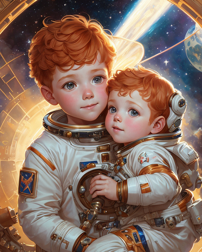 a little boy with a cherubic michievous face and ginger hair. he is an astronaut, wearing a space suit. clean elegant painting, beautiful detailed face. by raymond swanland and artgerm and greg rutkowski and (alphonse mucha