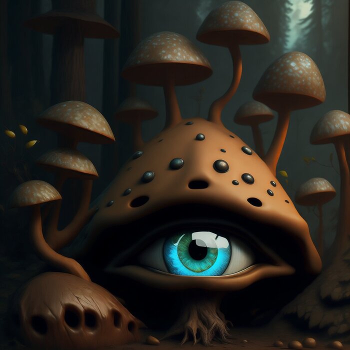 a mushrooms with eyes in the middle of the cap, painting of a blue eye surrouned by mushrooms and trees with blue eyes in the middle of the picture, fantasy artwork, a surrealist sculpture, psychedelic art, cinematic, epic realistic, faded, ((neutral colors)), art, (hdr:1.5), (muted colors:1.2), pastel, hyperdetailed, (artstation:1.5), warm lights, dramatic light, (intricate details:1.2), vignette, complex background