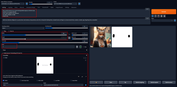 Также пробовал генерировать похожих персонажей на шуме через вкладку img2img, но получалась фигня. Вроде и неплохо, но часто лисицы были вообще не похожи + на лице не было шерсти, а она была нужна! Это одно из главных условий, достичь которое удалось с помощью белого квадрата и ControlNet.