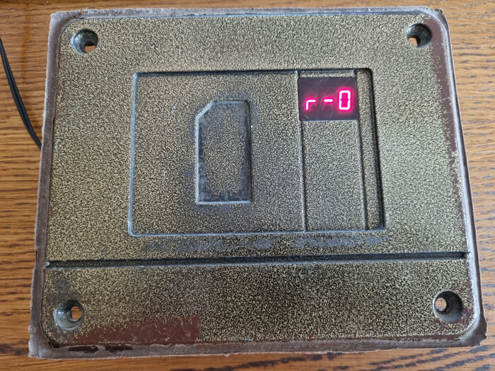 А вот и сам аппарат. По центру углубление в виде прямоугольника со скошенным углом для ключа, в углу — семисегментный трёхразрядный индикатор.