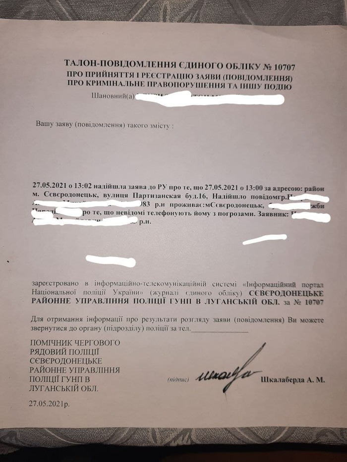 Полиция дала корешок, что мол заявку приняли «Угрожают неизвестные». Как неизвестные, если очень даже известные?!, ну ладно посмотрим, что будет дальше.