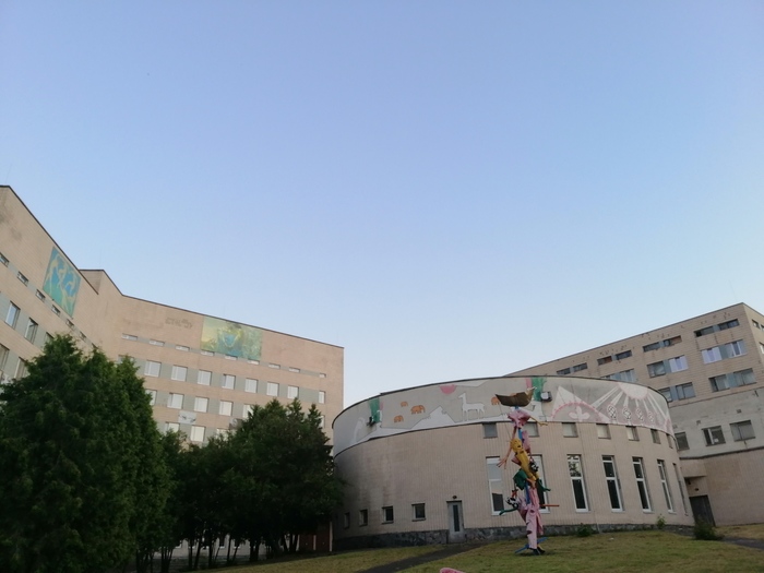Корпус украшен муралами и картинами. Вверху выцветший Демон Врубеля (кстати, сам художник тут тоже лечился, демоны одолевали его и в реальной жизни). Чуть левее - "Танец" Матисса