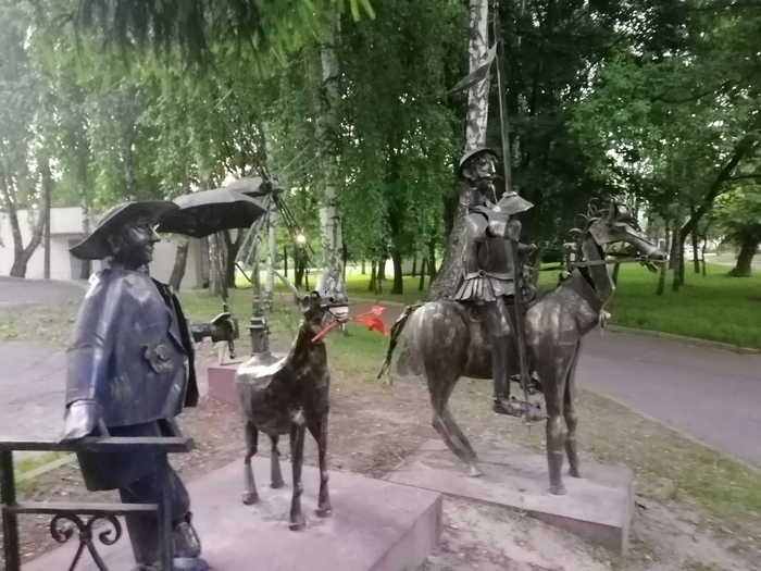 Дон Кихот с Санчо Пансой и ветряной мельницей на заднем плане