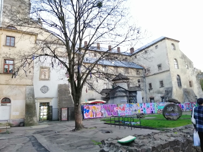 Перед входом — галстучное дерево. По-украински галстук называется «краватка». Это искажение от изначального слова «хорватка». Вообще шейные платки носили хорватские офицеры. После победы над янычарами их позвал к себе король Людовик. Известный шмоточник, увидев косынки на шеях офицеров, захотел себе такое же. Возникла мода, галстук постепенно удлинялся, пока не приобрел современный вид.